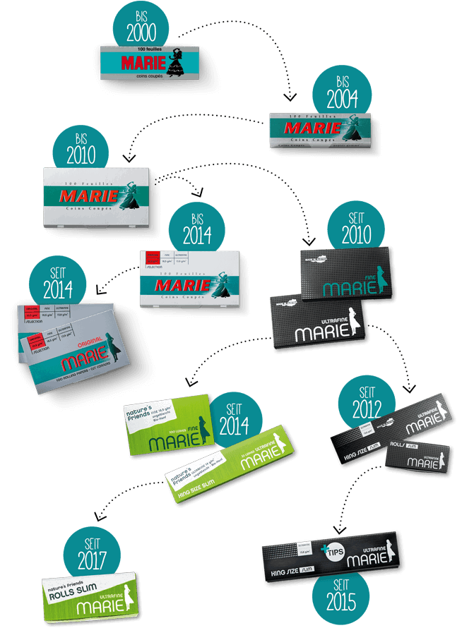 -Im Jahr 2007 stießen MARIE Extra Slim Papers mit der originalen Papierstärke sowie Eindrehfilter und Duo Roller zum Sortiment dazu.