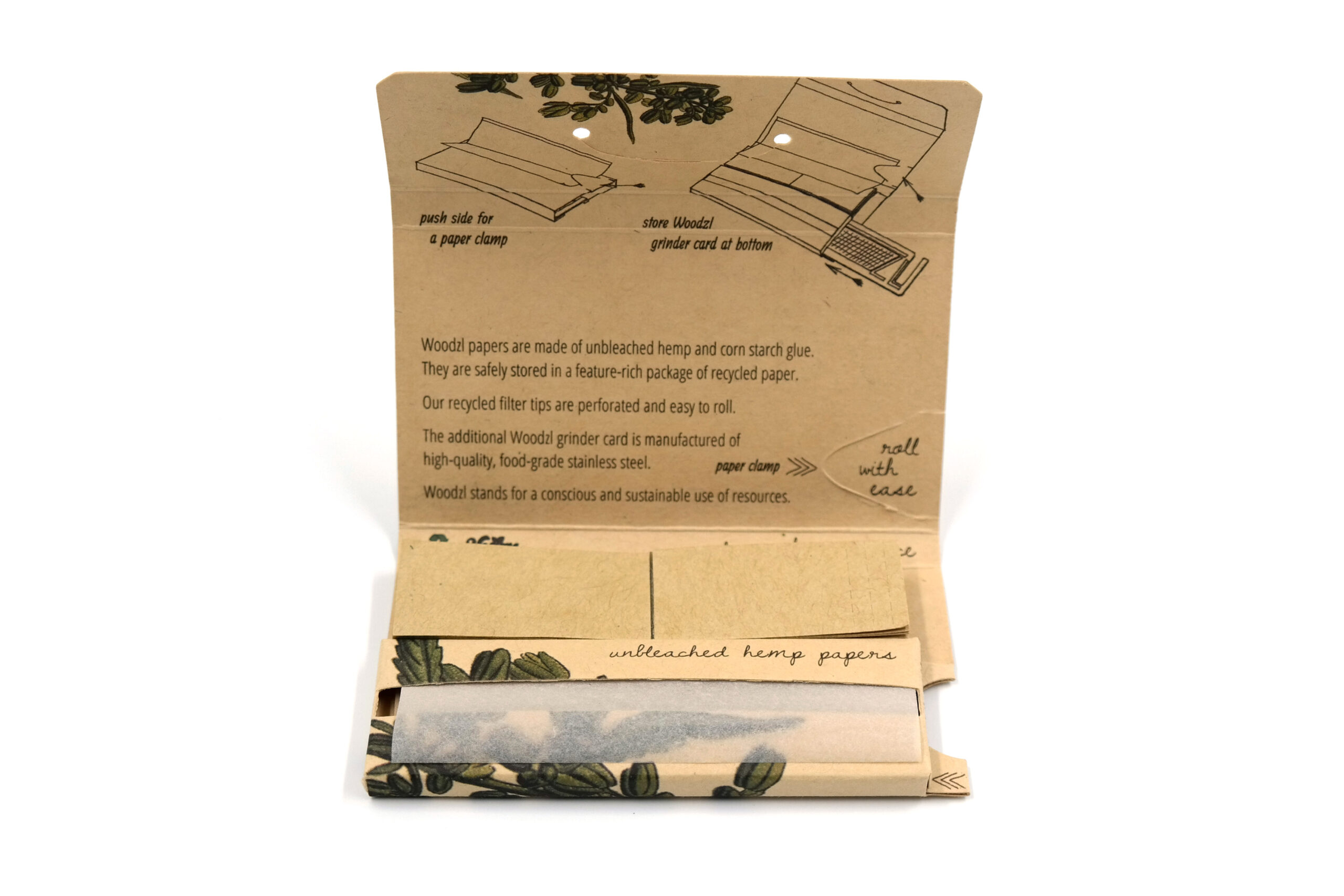 Filtertips und Verpackung sind aus recyceltem Karton gefertigt. Das Booklet kommt ohne Kunststoff, Gummi oder Magnet aus, weshalb es vom umweltbewussten Raucher direkt im Papiermüll entsorgt werden kann. Das Paperbooklet besticht mit seinem unauffälligem, aber für den Kenner eindeutig identifizierbaren männlichen Hanfblüten-Design.